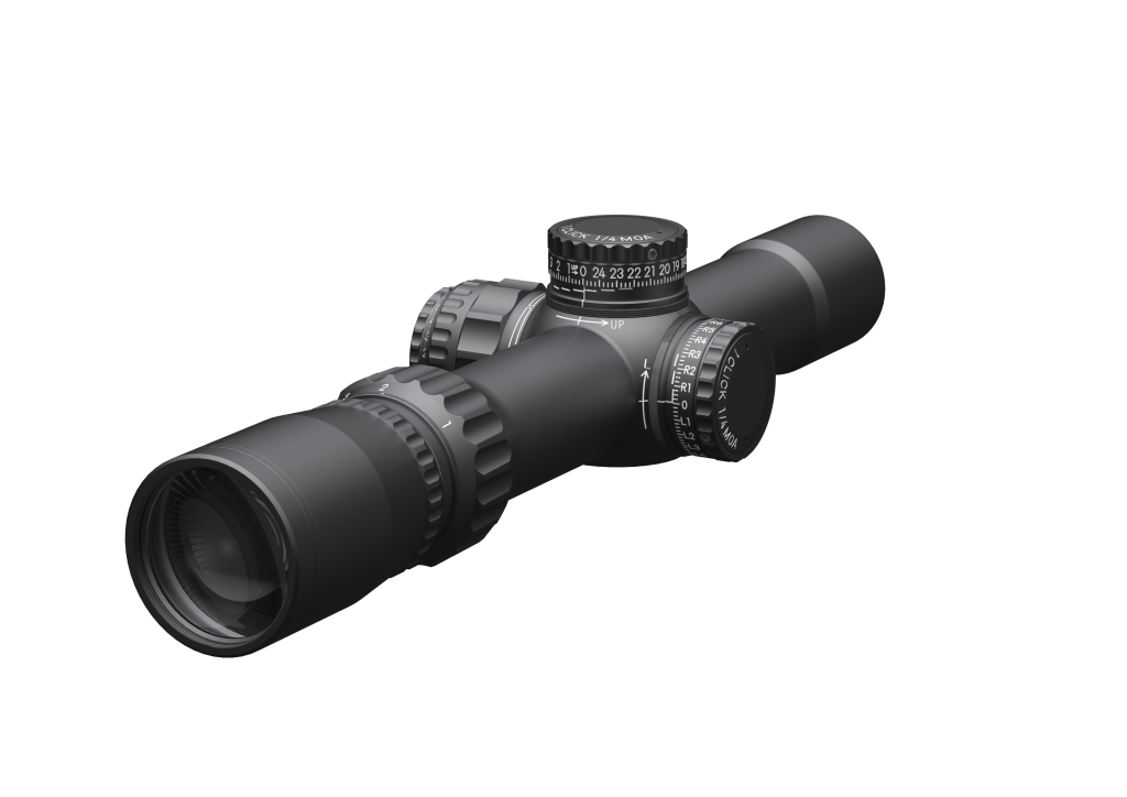 Compact 1-4×24 mm scope with fibre-illuminated FD-1 reticle, simple parallax-free design, and an industry-leading 17.4 mm exit pupil. Precision-machined from solid alloy for exceptional clarity and recoil durability, with capped MIL turrets and FD-1 or FD-2 reticle options, illuminated or non-illuminated.