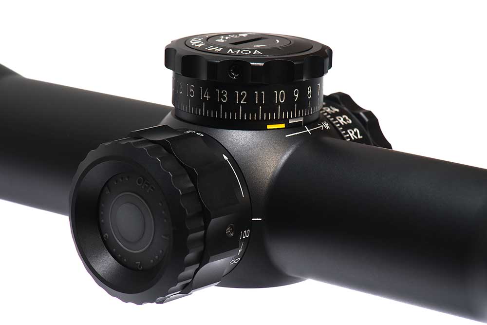 The MARCH 2.5x-25×42 Rifle Scope comes in illuminated and non-illuminated versions. Standard and Low illumination modules are available. Both modules provide four levels of reticle intensity (red) and can be cycled by simply pressing the pressure switch within the focus dial on the left side. Very effective feature at dusk or when aiming at a dark target. Auto shut-off too to save battery life. If illumination is not activated, the reticle remains black as per the non illuminated model. Additionally, with the capability to set any position as the zero point in the elevation (0-set feature), the shooter will never lose their starting calibration point.