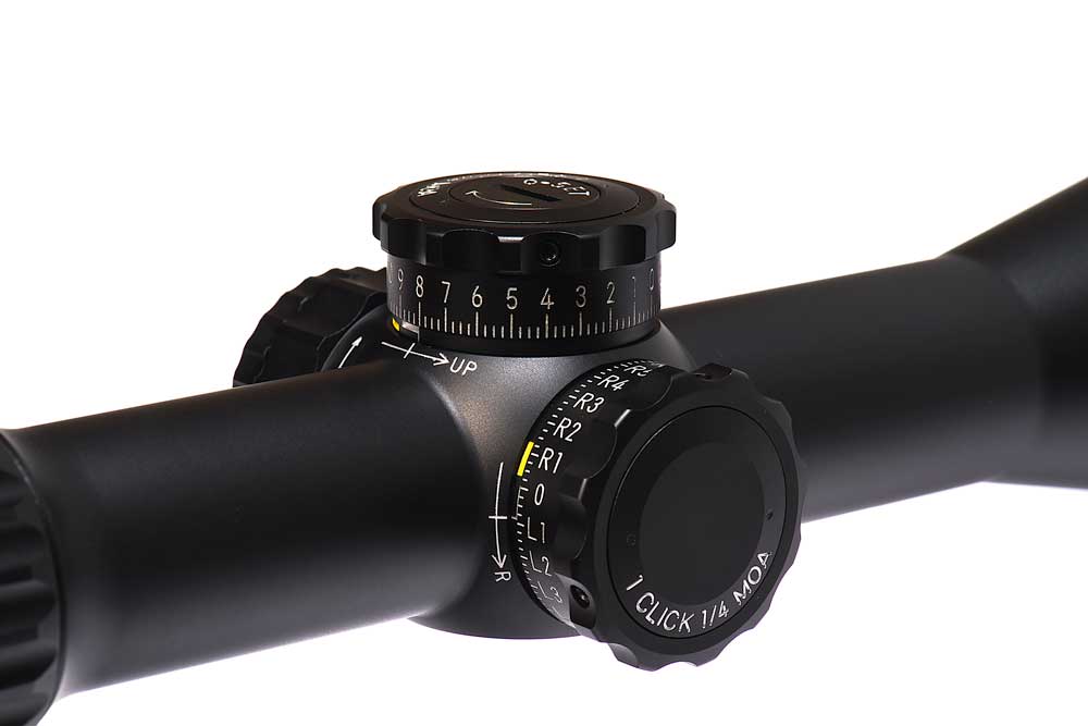 The dial has 25 MOA per one rotation of the dial and 1/4 clicks. For Mil Radian there is 10 mil per one rotation of each dial and 1/10th clicks. Each Tactical scopes comes with Sun Shade and March Tactical Flip covers.